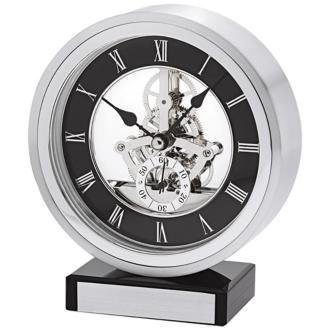 Add this brushed aluminum and chrome finish Bulova mantel clock to your home for a contemporary decor upgrade. Solid aluminum housing in a brushed finish is enhanced by a chrome finish bezel, skeleton movement and seconds subdial. Black chapter ring with chrome finish numerals and a black crystal base finish off this wonderful design. Great on the mantel and makes a great table clock, too. Solid aluminum housing. Brushed finish. Chrome finish bezel, skeleton movement and seconds subdial. Black crystal base. Takes one AA battery (not included). 6 1/4" high. 5 1/2" wide. 2 1/2" deep. Includes a 3 1/4" x 1/2" engraving plate (not included)..../ Omni Brushed Aluminum 6 1/4" High Bulova Mantel Clock / Clocks Table